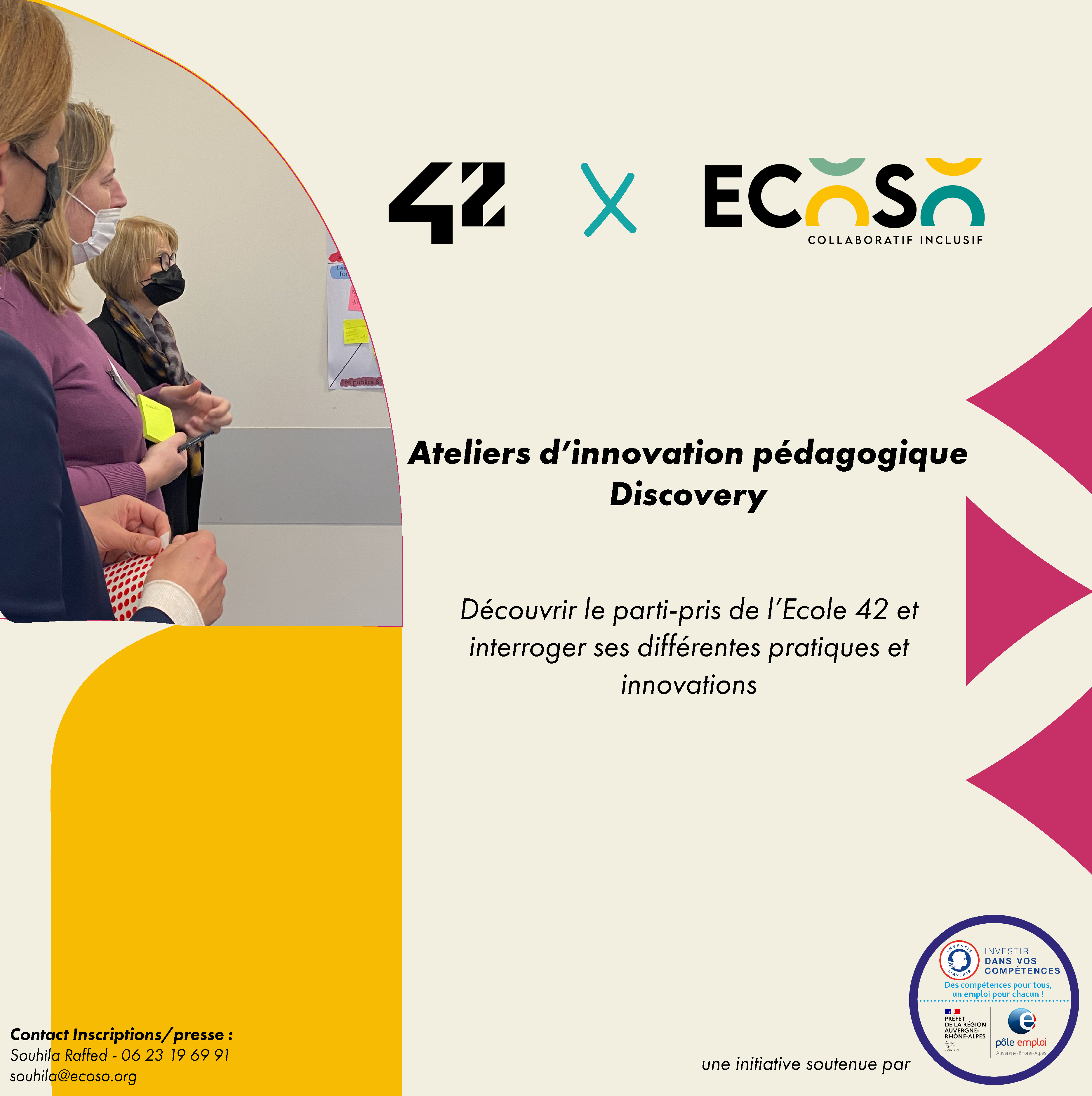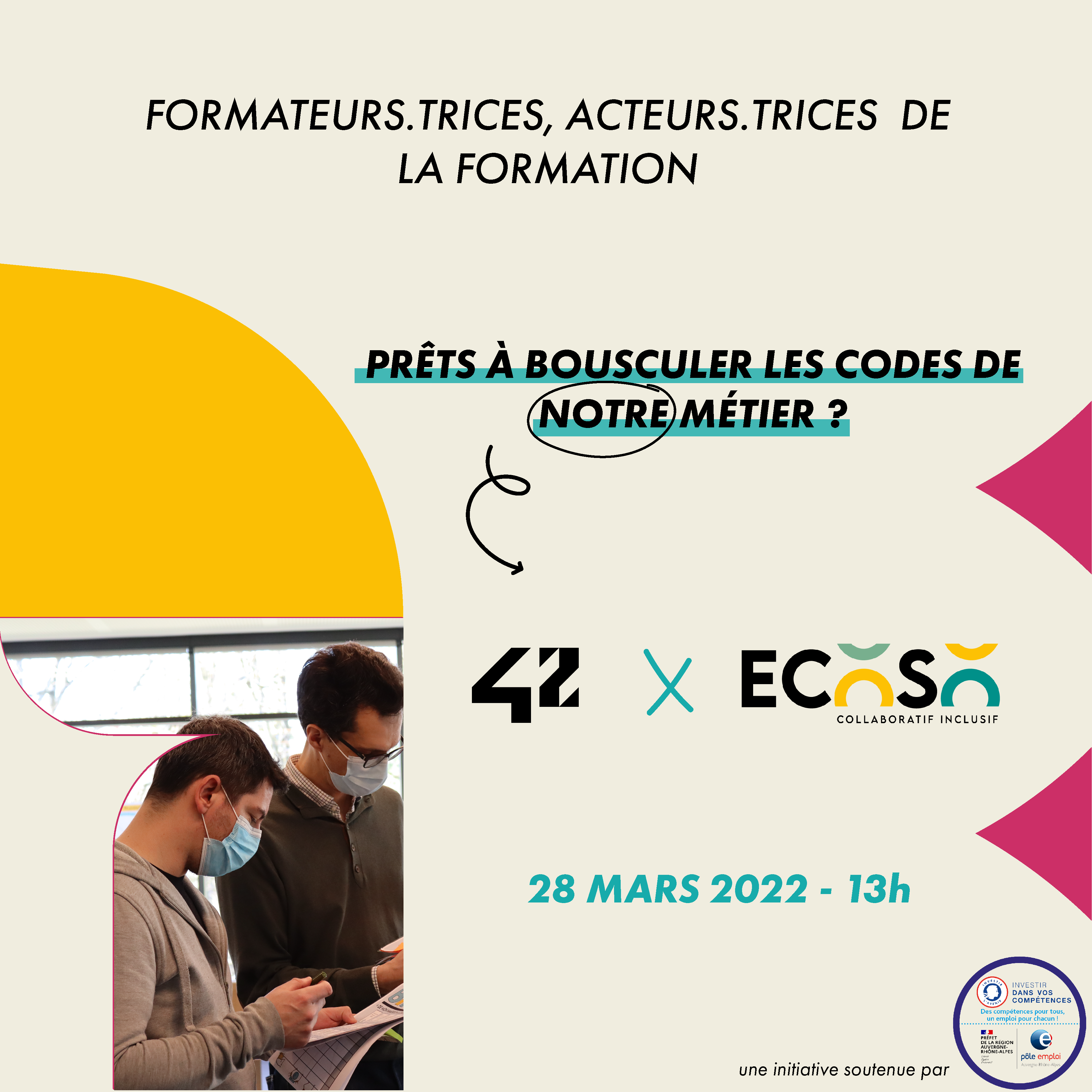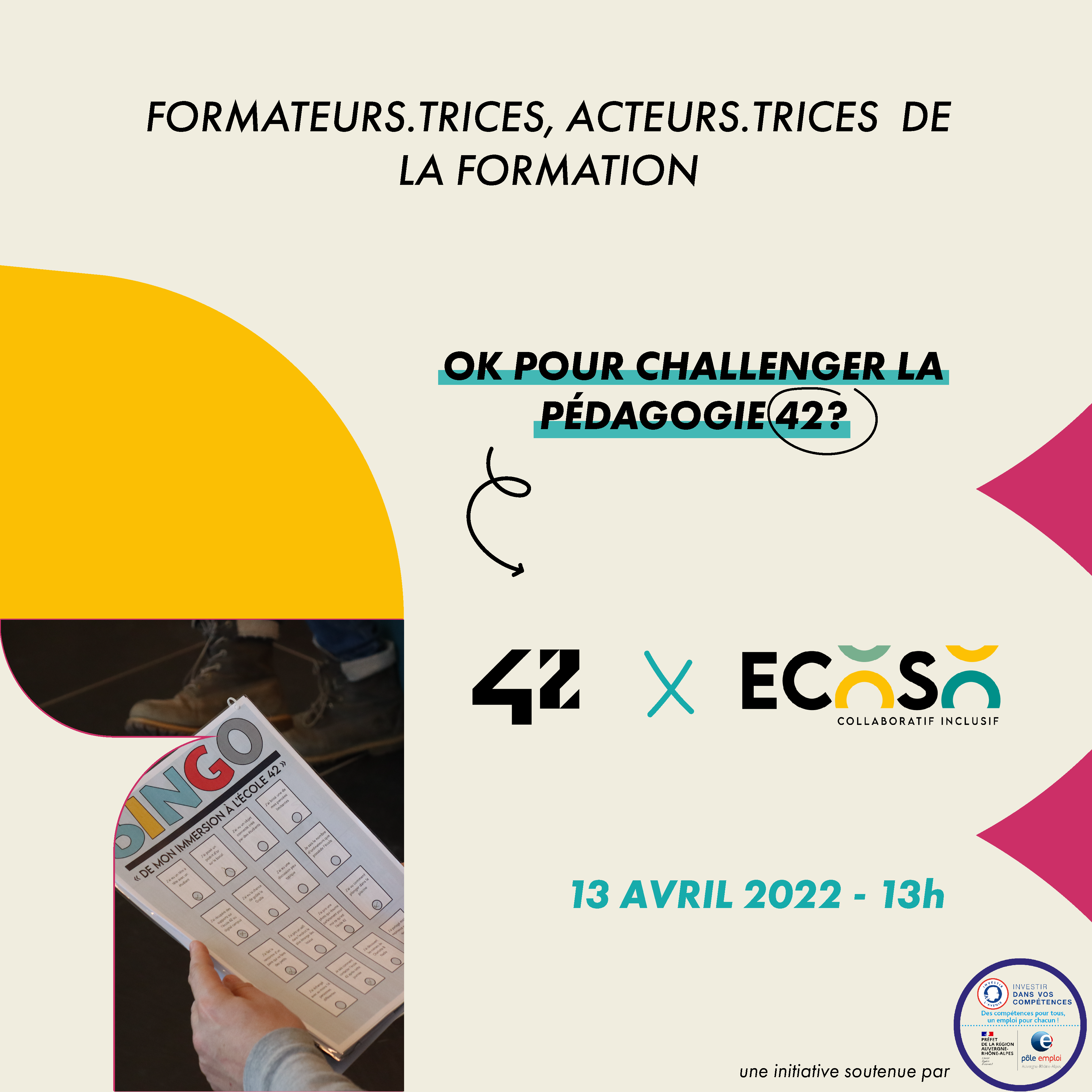 École 42 Lyon et EcoSo font appel à vous, formateurs et formatrices, pour la deuxième édition des Ateliers Discovery. Cette année encore, c’est à vous de bousculer les codes de l’apprentissage! Pour cela, EcoSo vous embarque dans un voyage d’une demie journée, le 13 Avril 2022, ensemble et grâce à des outils conçus par Charlotte, vous nous parlerez de votre pratique de formateur et vous découvrirez les méthodes de l’Ecole 42. Et ensuite? Nous écrirons la suite, le renouveau de nos méthodes pédagogiques !