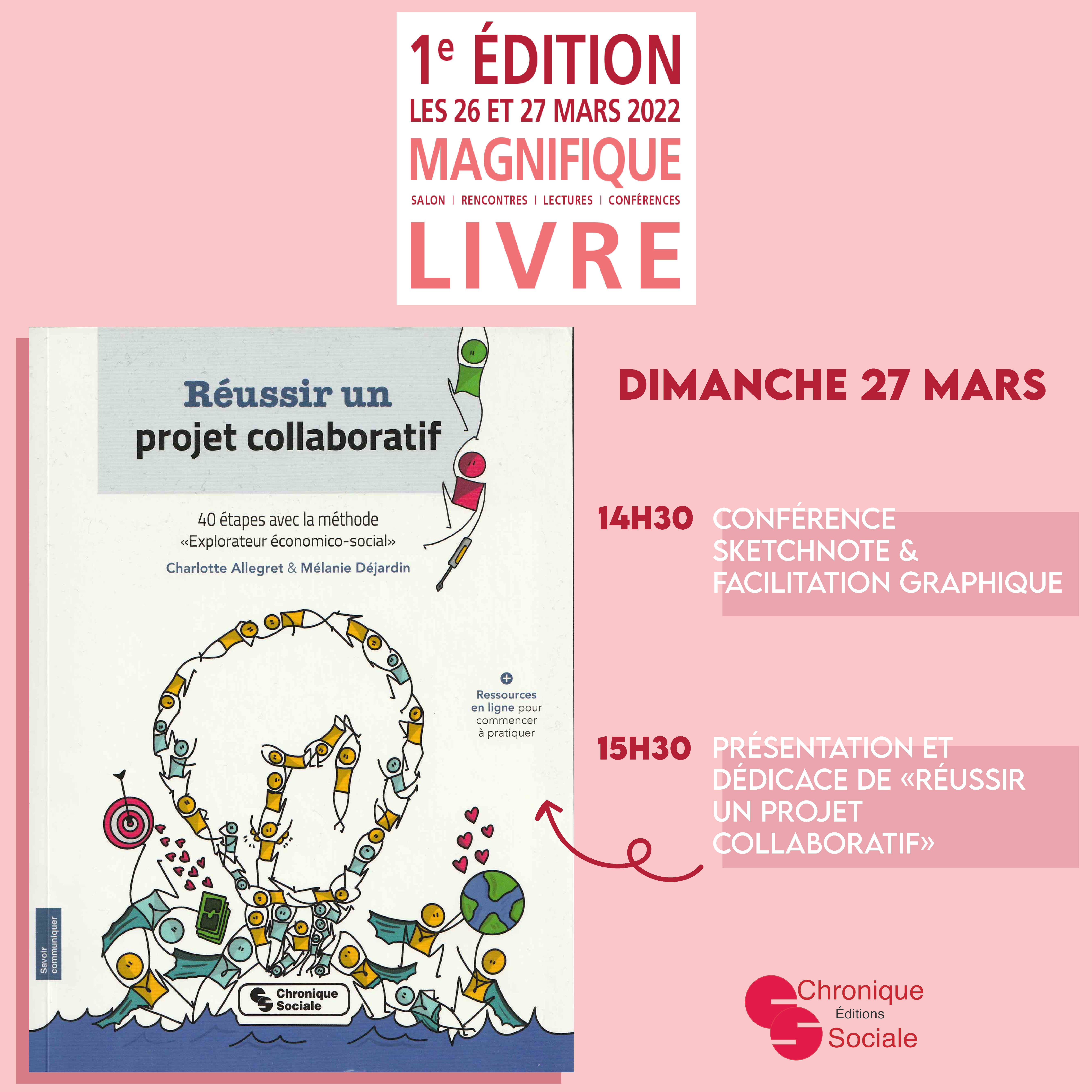 Charlotte aura le plaisir de vous retrouver pour la première édition du salon Magnifique Livre au Palais de la Bourse. Le dimanche 27 Mars, à 14h30, Charlotte vous propose une conférence pour apprendre le sketchnote et la facilitation graphique. Dans un deuxième temps, à 15h30, assistez à une présentation et à une dédicace du livre Réussir un Projet Collaboratif paru en 2019 chez Chronique sociale.