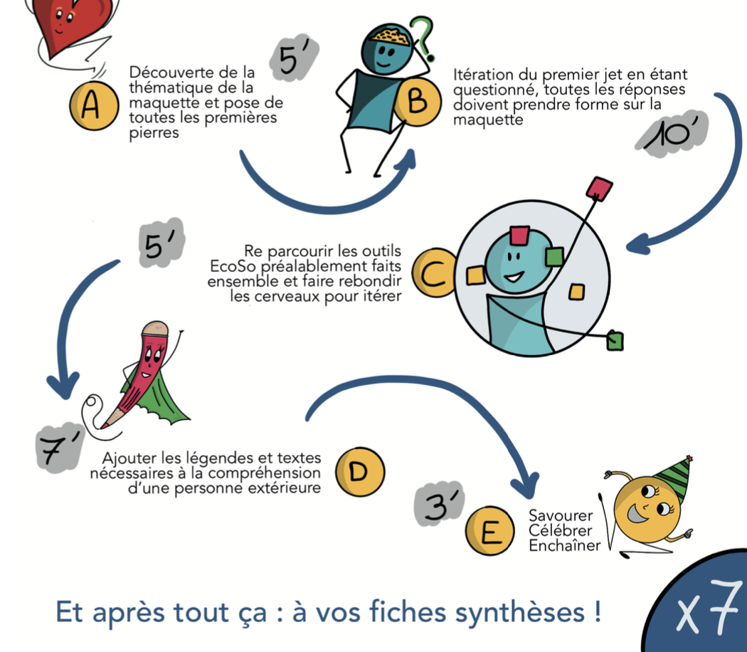 Vous allez vous poser toute une série de questions et les poser collectivement sur une maquette. En suite nous interprétons et questionnons ensemble tous les éléments posés sur ce prototype de votre passé, présent & futur. Les conclusions sont modélisées sur des fiches synthèses, terreau d’un futur plan d’actions.