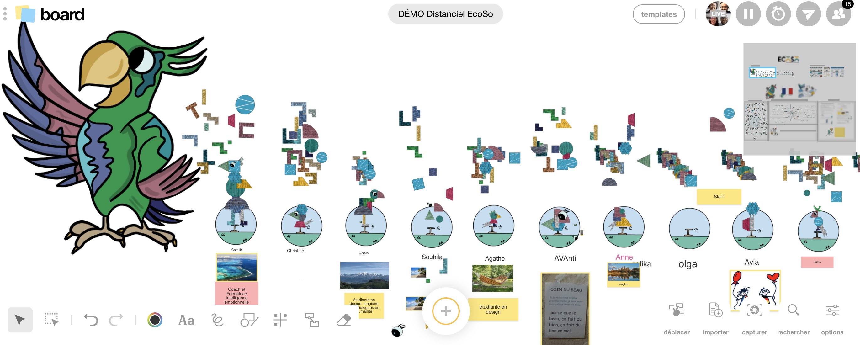 Formée à l’animation à distance, l’équipe d’intervenants est en capacité de répondre au besoin distanciel des bénéficiaires des formations EcoSo. La plupart des canevas graphiques et jeux collaboratifs sont déclinés ou déclinables sur la plateforme Klaxoon, rendant possible les phases d’idéation, de co-création et de prototype.