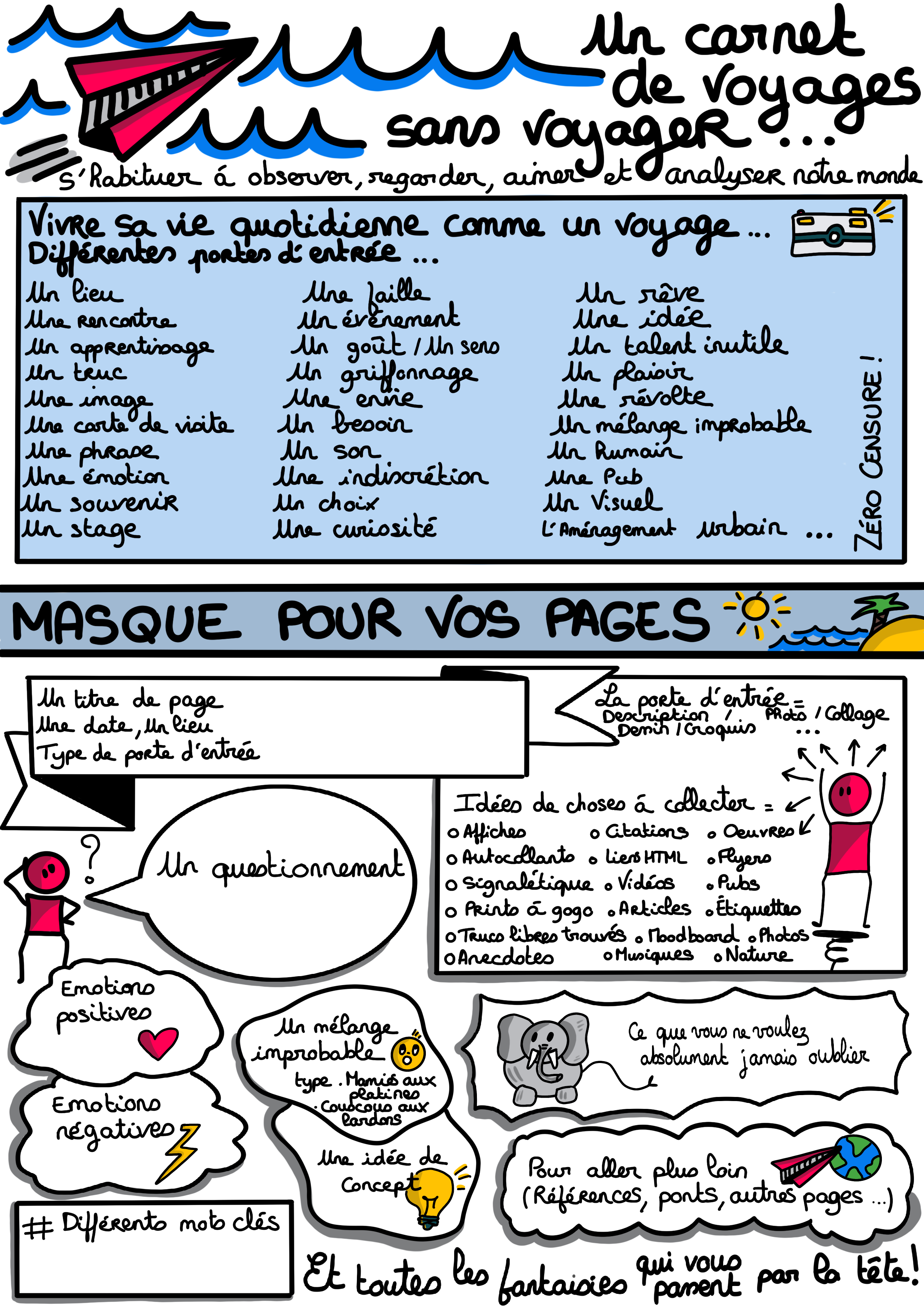 Des phrases, des dessins, des mots clés, du collage… Et surtout apprenez à supporter votre carnet et ses pages dans leur imperfection. C’est la clé pour prendre plaisir et l’habitude d’être curieux de tout.